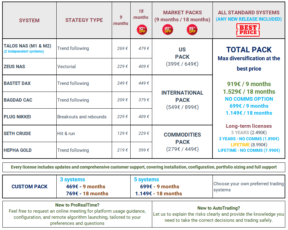 Ofertas flexibles adaptables a tus necesidades y capital. Obtén sistemas individuales, diferentes packs (por número de sistemas o por mercados), o nuestra oferta completa con el TOTAL PACK.