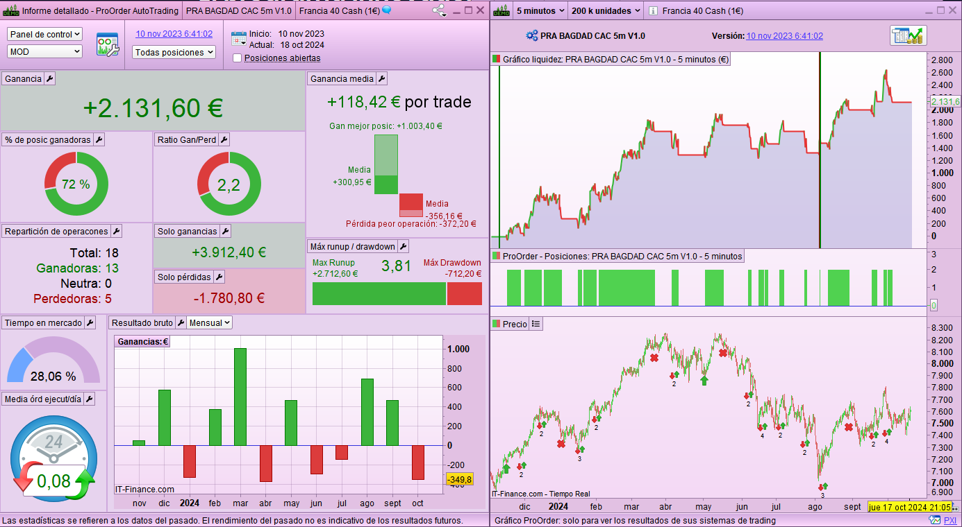 Don’t be fooled: Results are shown for fixed contracts at € 1 per point. Only 1 position at a time. Without martingales or partial closures (MM available, but not shown in results). Different configurations are available, and visible and non-obfuscated code. Visible headers in ProRealTime screenshots are shown here, distinguishing between backtest, real and demo in each case (avoid screens without headers and quick photoshops ????). Available versioning and results full information in our website and groups, with full tracking.