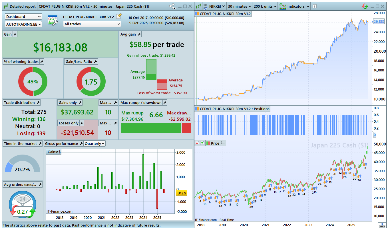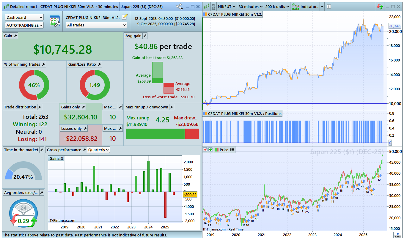 PLUG-IN-BABY is a multimarket and customizable system specialising in breakouts and rebounds. Works in a 30-minute timeframe and currently fits for multiple INDEX (FX and stocks under review). The strategy looks for rebounds and breakouts, increasing the portfolio’s robustness in complicated scenarios. The strategy is intended to be profitable in all cases, and extremely powerful in chopped scenarios simultaneously.
